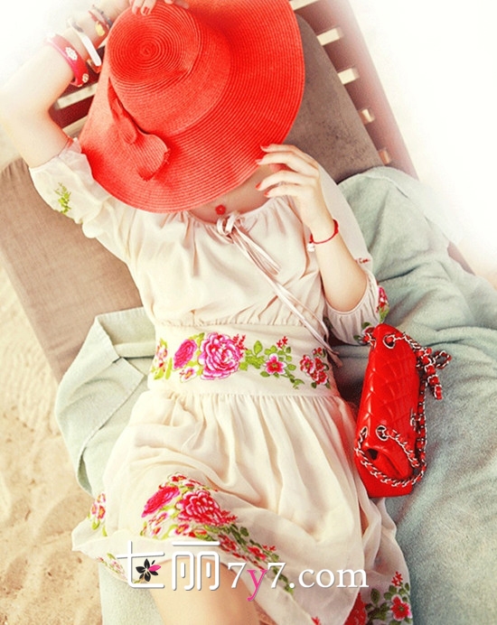 搭配看点:米色民族风碎花连衣裙十分的别致和个性哦,同时中袖的设计还能遮住手臂的肉肉,对于手臂有赘肉的菇凉来说是个不错的选择哦。配饰上选择与印花同色的红色遮阳帽和链条包,让造型更加统一和谐,十分具有时尚韵味呢。
