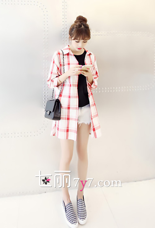 搭配看点:格子衬衫内搭T恤和牛仔短裤十分的性感和清新,只要注意这三件单品的配色协调就可以了,因为格子衬衫本身就占据两种以上的色彩,所以其他单品就尽量选择黑白灰无色系了哦,这样的搭配才大气和出众。鞋子可以更具个人喜好搭配尖头平底鞋、帆布鞋或纯色乐福鞋,包包选择个性的手拿包、链条包或mini斜挎包都十分有范儿。