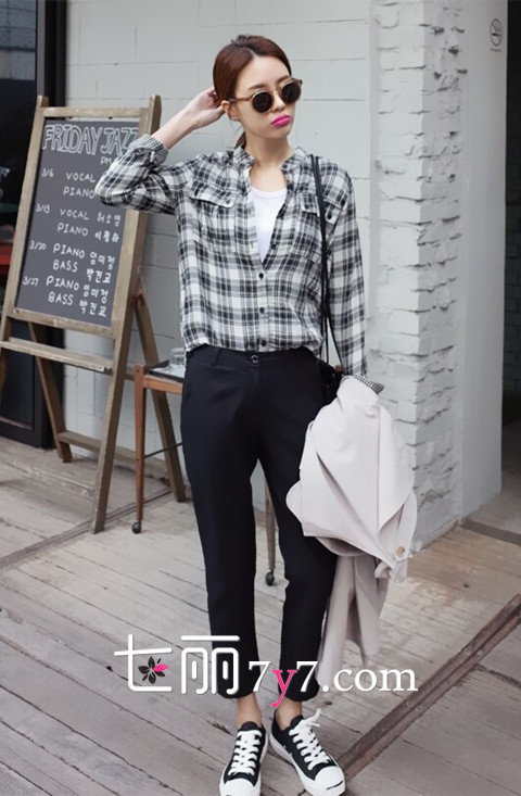 搭配看点:哈伦裤作为本季最热的时尚单品之一,绝对是每个时尚菇凉必备的单品哦,不管是百搭的黑色款还是优雅的灰色款都十分时髦有范,搭配格子衬衫也十分个性出众,鞋子选择一款和裤装同色的帆布鞋显高又极具时尚韵味哦。