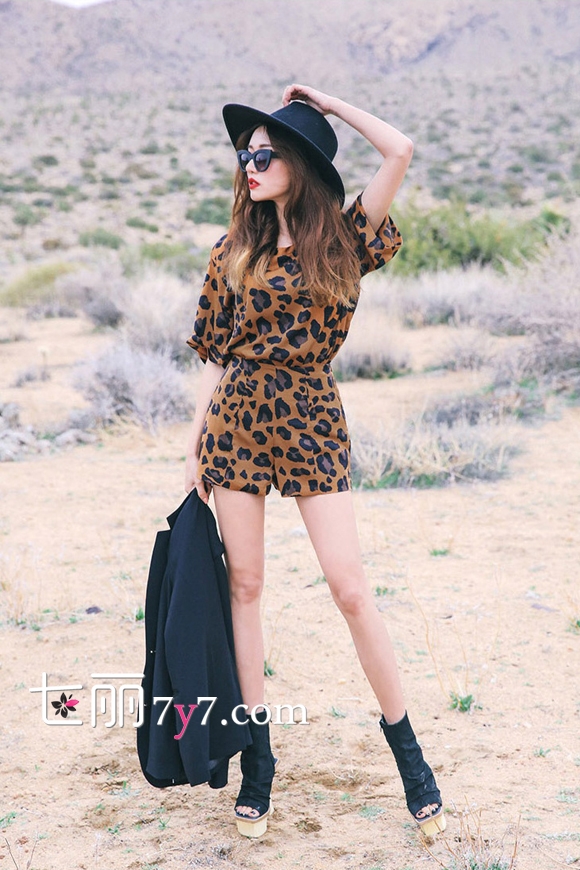 搭配看点:豹纹垂坠感上衣+豹纹高腰短裤+黑色鱼嘴踝靴+黑色大沿帽。上衣与短裤均是性感的豹纹图案,就像一只优雅的猎豹,展现无尽帅气与狂野,矗立在人群中仿佛有着风一样的速度与激情,充满了酷炫时尚感。上衣与短裤都是简约的款型,带来干净利落的视觉感受,搭配上一双黑色鱼嘴踝靴,张扬的街头气质,头上的时尚黑色大沿帽,演绎不拘一格的潮流范
