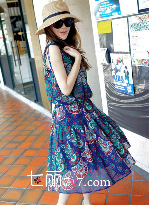 搭配看点:别致的印花图案总能轻易的吸引眼球,宝蓝色系更加适和气质的轻熟女,搭配一顶遮掩帽,一款时髦的墨镜,轻松穿出夏日好心情。