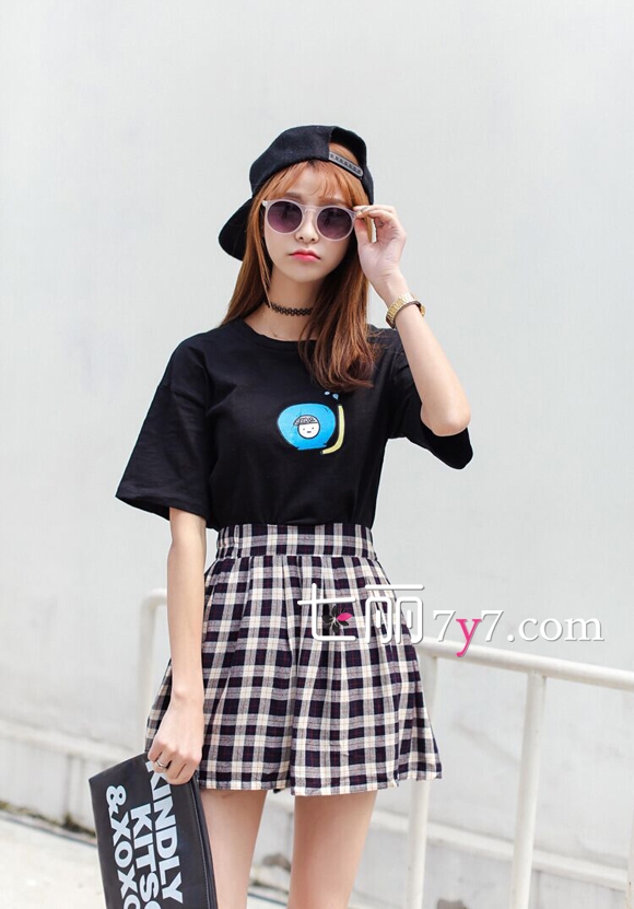 搭配看点:黑色嘻哈T恤+黑白格纹高腰裙+黑色棒球帽。非常嘻哈休闲的一款宽松大T恤,十分运动阳光的风格,下身混搭一条学院风的小清新黑白格纹高腰裙,可爱又时尚。
