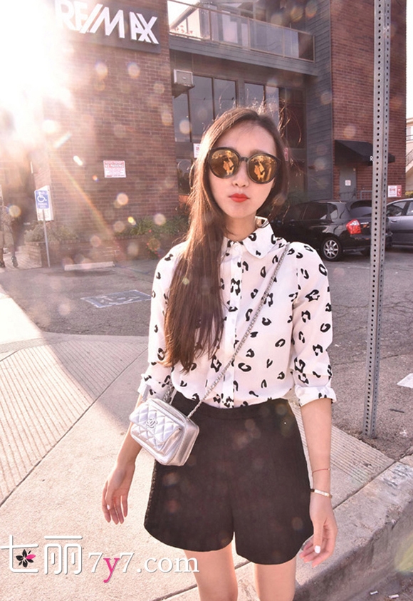 搭配看点:白色豹纹印花衬衫+黑色高腰短裤。时尚满分的豹纹印花长袖衬衫,迸发张扬魅力,很好的诠释了豹纹带来的妩媚气质,白色的底色,靓丽青春,更换了原本豹纹的狂野气息,印花图案新颖,时髦宽松的复古版型,不仅舒适还能修饰MM的腰部线条哦,搭配一条简约的黑色高腰短裤,既时尚又大气。