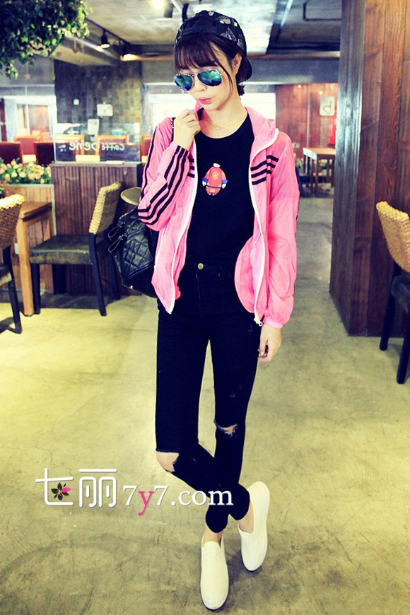 搭配看点:荧光粉色防晒运动外套+黑色打底T恤+黑色破洞牛仔裤+白色休闲鞋。荧光色糖果粉色条纹连帽防晒衫,短短的外套百搭又时尚,下身搭配紧身黑色破洞牛仔裤,运动鞋,帅气又拉风。荧光色配黑色是最安全牌的选择,让人把注意力全部集中在你亮眼的外套上。