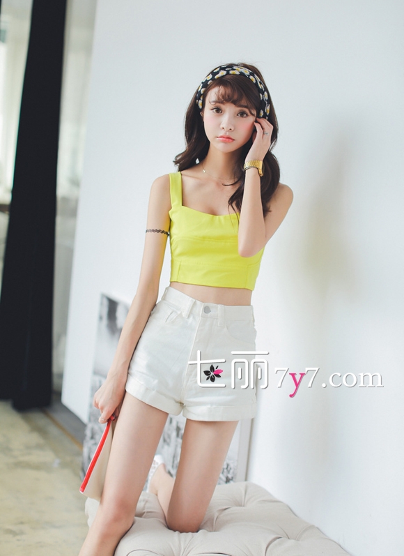 搭配看点:荧光黄色短款露腰背心+白色高腰短裤。非常简约性感的一套装扮,荧光黄色的短款背心,十分考验身材的露腰设计,有一种美式的阳光性感的味道,下身搭配一条白色的高腰短裤,二者的配色十分和谐。