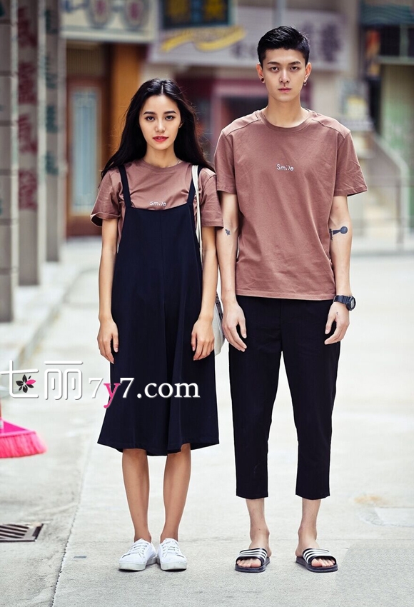 搭配看点:藕色简约T恤+黑色背带裙&裤子。极简的藕色T恤,款式大方又经典,唯一的装饰只有胸前的一行英文单词。女生搭配一条黑色的背带连衣裙,男生搭配一条黑色七分裤,看上去和谐又自然,其实情侣装不一定要穿得一模一样哦,稍微变换一下造型也能展示你们的情侣风采。