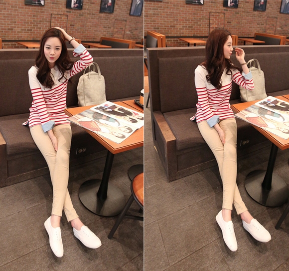 搭配看点:红白条纹针织衫+奶黄色紧身小脚裤+白色休闲鞋。十分学院风的搭配。红白条纹的针织衫,红色和白色的美妙横向交织,甜蜜又清新,袖口微微露出的浅蓝色内搭,又加入了知性的味道,搭配一条奶黄色紧身小脚裤和一双白色休闲鞋,青春的校园感觉一应俱来。