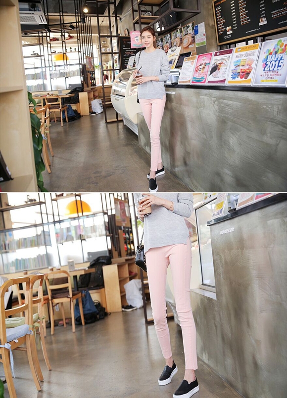 搭配看点:极简风浅灰色长袖上衣+浅粉色紧身牛仔裤+黑色休闲鞋。灰色与粉色的搭配能够给人以一种优雅知性的感觉,自欧美推崇极简风以来,韩流时尚也纷纷效仿起来,简洁大气的灰色长袖针织衫搭配同样简单的浅粉色裤子,只要随意搭上一双黑色休闲鞋就可以出街啦。