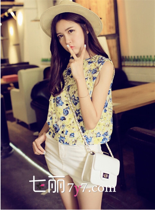 搭配看点:白色短裤搭配清新的印花雪纺衫抢眼又舒适,不过因为印花上衣本身的色彩就很多了,所以鞋子或包包建议选择白色或黑色哦,或者从印花上衣中挑选一种面积较多色彩来搭配会更加和谐和出众。