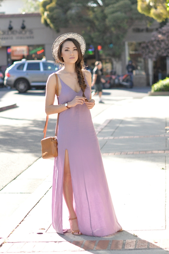 搭配看点:浅色薰衣草吊带高开叉雪纺连衣裙+棕色复古单肩背包+度假风编织草帽+裸色高跟鞋。淡淡的熏衣草色是每个女孩的童话梦想,极简的款式,没有复杂的装饰也没有多余的设计,却看起来十分舒服,搭配一只棕色复古单肩背包与一个度假风编织草帽,看上去淡淡的文艺气息,穿一双裸色高跟鞋,无限拉长你的美腿,女神范儿十足。