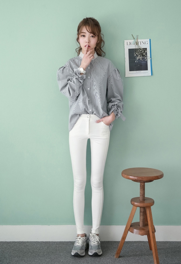 搭配看点:小条纹蕾丝花边复古衬衫+白色紧身小脚裤+灰色运动鞋。小条纹的衬衫,清爽又大方,加上细节处蕾丝拼接的衣领以及袖口的蓬松设计系带设计,可爱甜美极了。搭配一条白色的紧身小脚裤,整个色调淡雅又清新,配上一灰色的运动鞋,混搭得恰到好处。