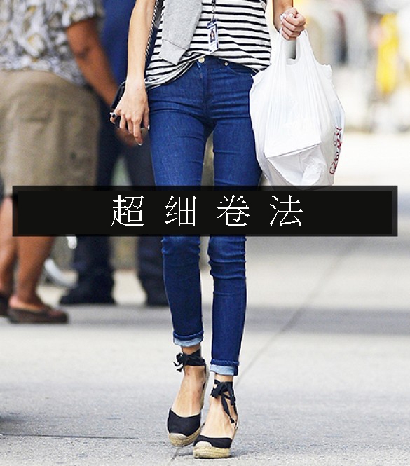 这种卷法比较适合版型紧身的小脚牛仔裤,建议小个子的MM尽量将裤脚卷到最细,露出脚踝即可。