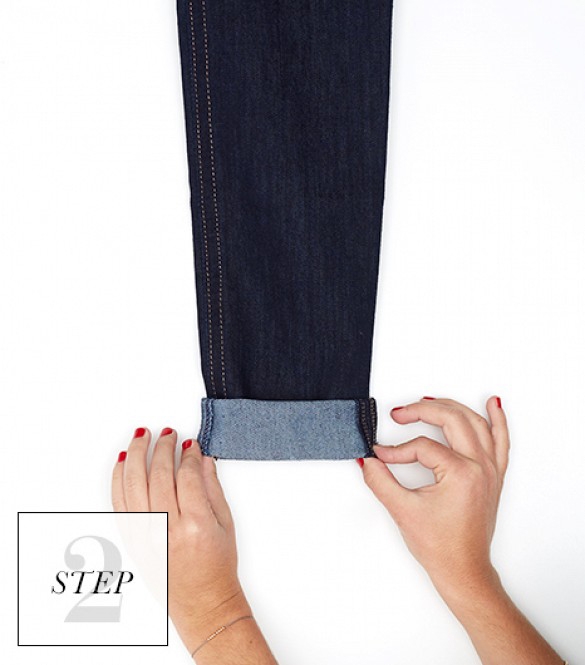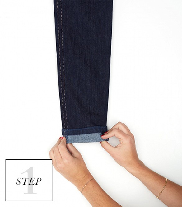 Step1. 先将裤脚卷起半寸(大约是牛仔裤锁边宽度的3倍)。