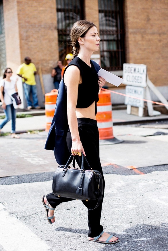 搭配看点:黑色休闲裤搭配露脐上衣十分的清爽性感,并且露出的肌肤还能很好的中和黑色带来的暗沉感,搭配一双个性舒适的平底凉鞋,很有街头范儿,缤纷夏日,就这样酷酷的出街吧。