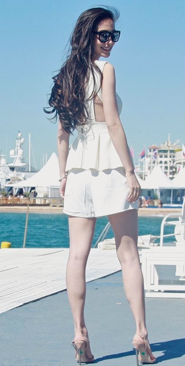 搭配看点:白色无袖上衣,后背配以挖空的设计十分性感,下摆拼接的荷叶边更添灵动和俏皮。搭配一条同色短裤,整个造型清新无比,不管是度假还是出街,都能轻松成为路人焦点,这样美好的人儿,黄教主怎能不爱呢。