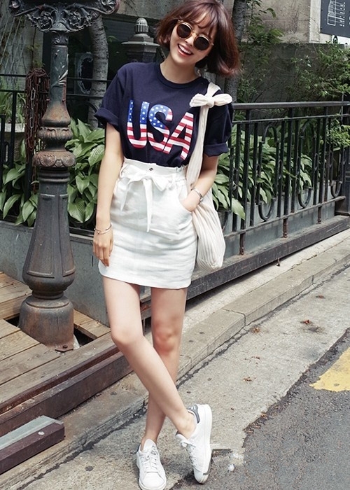 搭配图片一:白色短裙+字母T恤+白球鞋+墨镜