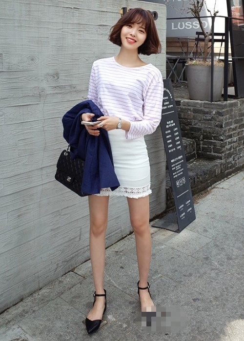 搭配看点:白色短裙搭配条纹T十分的甜美,尤其是红白条纹T,黑白条纹则更具摩登范儿。也可以选择一字领的款式,更具复古气息。鞋子选择尖头平底鞋十分的舒适和显高,非常适合出街或出游选择。炎炎夏日,白色短裙搭配一件短袖或无袖条纹T十分简约清爽哦。