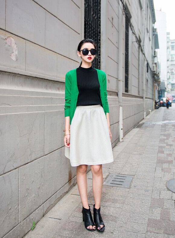 搭配看点:草绿色开襟针织衫+黑色打底衫+白色高腰中裙+黑色踝靴。配色简单又大气,草绿+黑+白的经典配色,舒服又清凉,不失为轻熟女或通勤装的绝佳配色。开衫与中裙的搭配看上去既有气质也足够知性,配上一双酷酷的黑色踝靴又加入了一些随性的味道。
