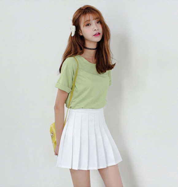 搭配看点:浅绿色短袖T恤+白色高腰百褶裙+黄色单肩小包。甜美的糖果冰激凌绿色穿起来特别清爽,浅绿色的短袖T恤搭配白色高腰百褶裙,学院风十足,再加上一个黄色单肩小包包,这样的搭配既减龄又不失青春活泼。