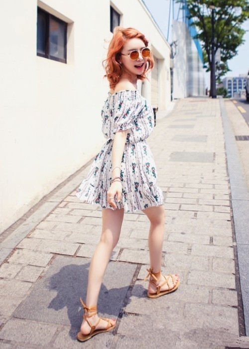 小个子夏季穿衣LOOK 1:露肩连衣裙+系带凉鞋