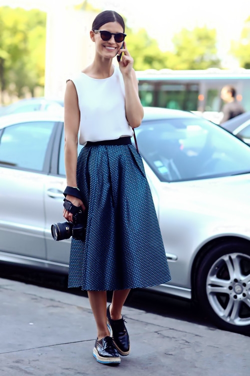 半身裙一直是时髦大咖的心头爱,不管是雪纺半身裙、印花半身裙还是chic的图案半身裙都十分性感抢镜,不过,半身裙搭配什么上衣才好看呢?下面就赶紧来看看当红的街拍潮人都是怎么搭配半身裙的吧。