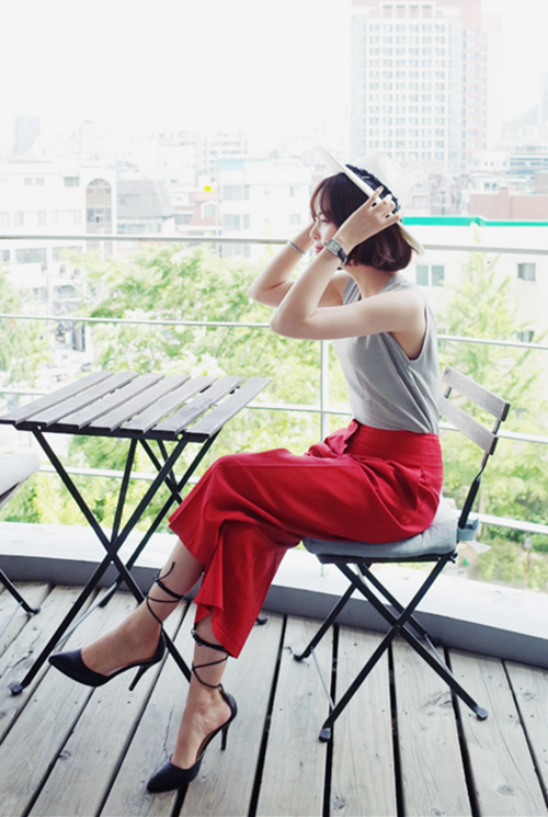 搭配看点:红色阔腿裤十分的炙热和热情,搭配一件灰色背心,休闲又充满活力。鞋子选择时下正热的系带高跟鞋,给人一种不羁的气质。