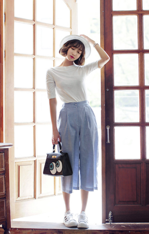 阔腿裤搭配图片:水蓝色阔腿裤+白色上衣