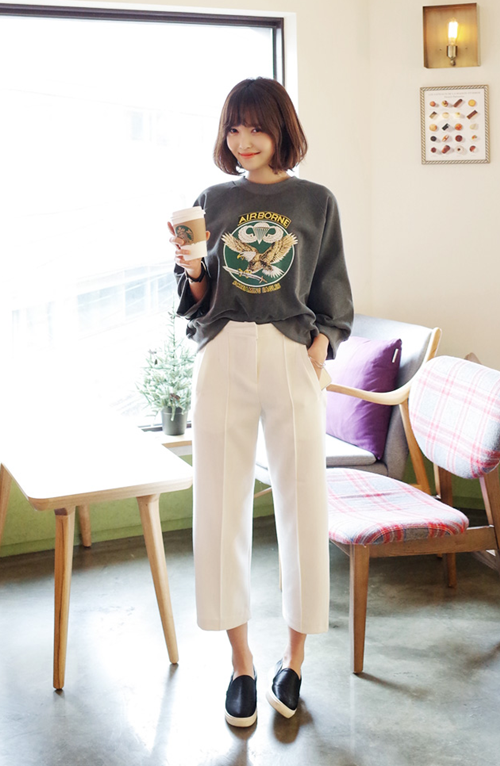 搭配看点:白色阔腿裤搭配灰色卫衣很有学院气息,适合学生MM尝试哦。