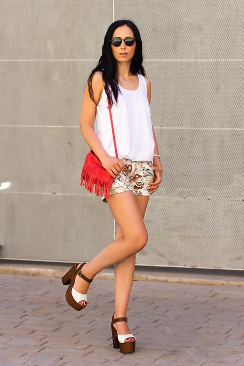 搭配七:印花短裤+白色吊带+厚底凉鞋