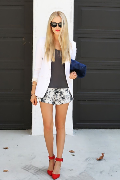 搭配八:印花短裤+吊带+高跟鞋+小西装