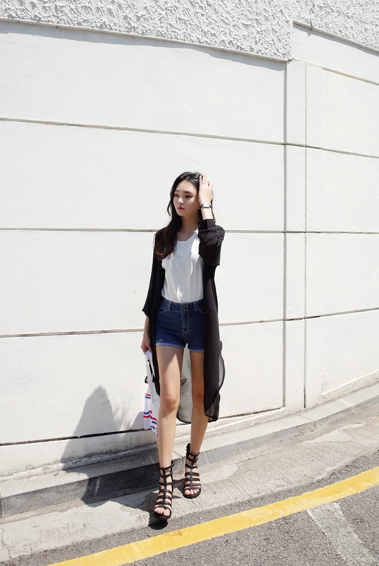 牛仔短裤搭配白色T恤或吊带都很有文艺气质,对于手臂有肉肉的菇凉还可以选择外搭一件雪纺衫,飘逸防晒还十分抢镜哦。