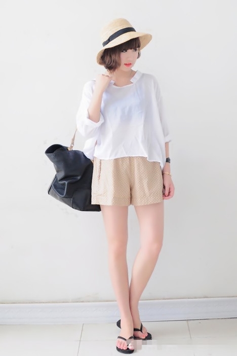 LOOK 5:宽松白色上衣+休闲短裤+人字拖+斜挎包