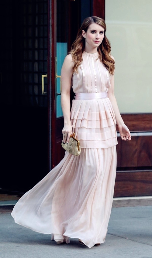 谁说矮个子女生不能穿长裙?艾玛·罗伯茨(Emma roberts)这身裸粉色雪纺长裙就十分柔美优雅,内搭一双高跟鞋就能轻松穿出高挑女神范儿。