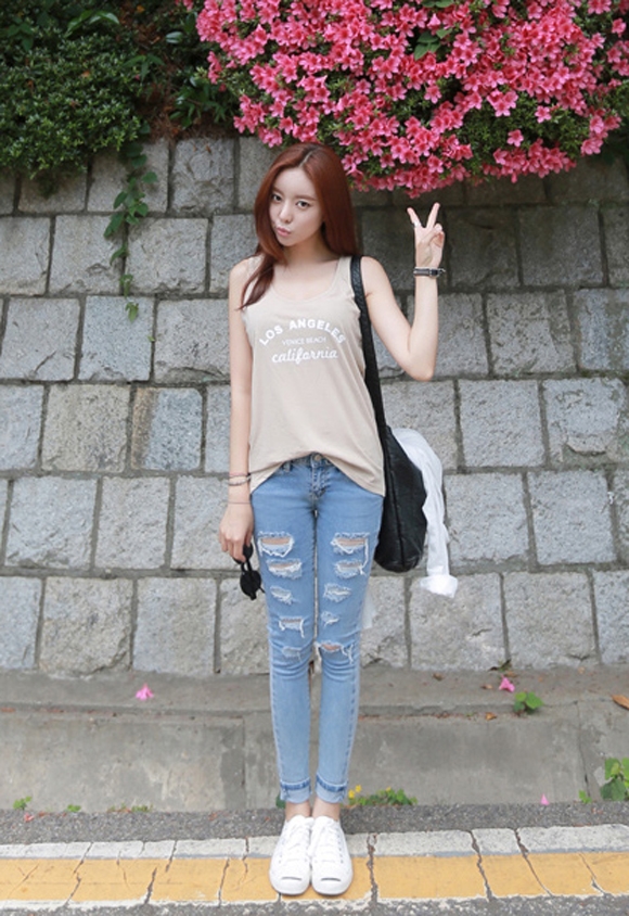 搭配看点:卡其色背心+浅蓝色破洞牛仔裤+白色平底鞋。浅浅的颜色搭配在一起,自然又清新,简简单单的搭配里透露着学院派的甜美,十分减龄哦。