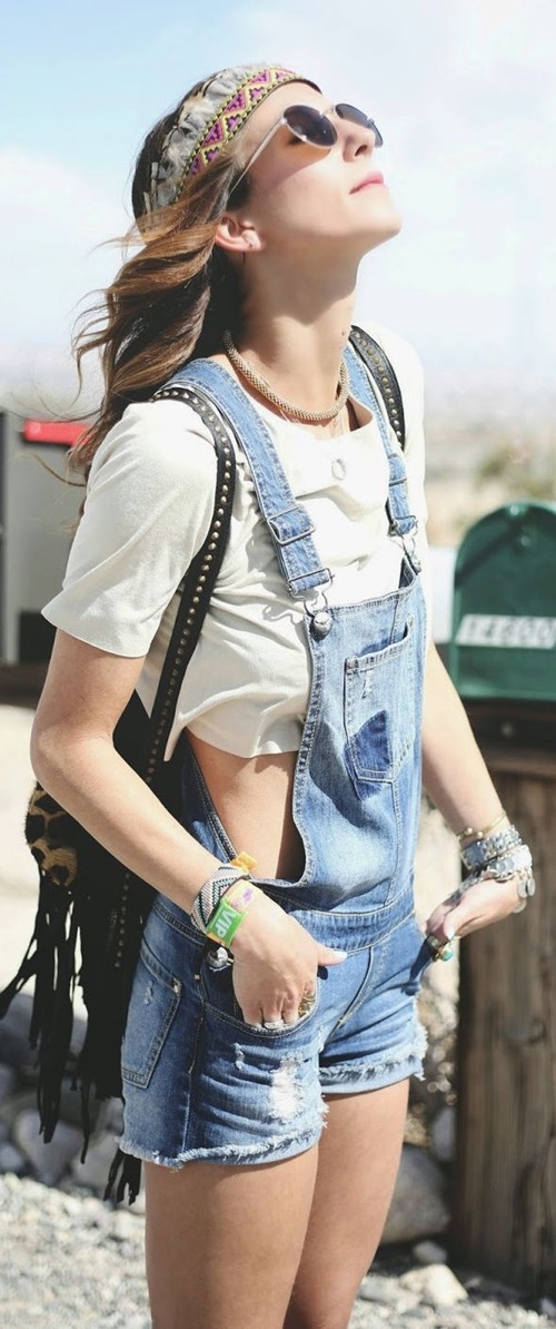搭配看点:牛仔背带短裤搭配白色T恤本来就十分清新干净,如果对自己的身材有自信,就选择一款白色短T吧,露出性感的小蛮腰,轻松穿出唯美夏日风情。配上别致的透视和双肩包,就这样去旅行也是一道美丽的风景。