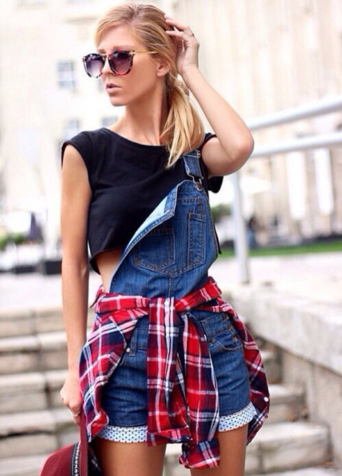 搭配看点:牛仔背带短裤只穿一边显得十分洒脱与不羁,内搭一件黑色短T,显瘦又帅气,腰间系上红色格子衬衫,强烈的色彩感十分抢镜,时尚icon就是这么气场强大。