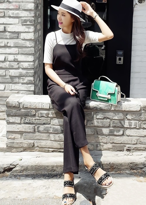 搭配看点:这款黑色背带裤很有复古气息,内搭白色中低领T恤带来一丝淑媛风范,头上的宽檐帽和脚上的名族风凉鞋都充满着浓浓的假日风情,这样的搭配不管是出街还是出游都吸睛满分哦。当然,最吸睛的还是那款糖果绿色手提包,为整个造型添加一抹清新风。