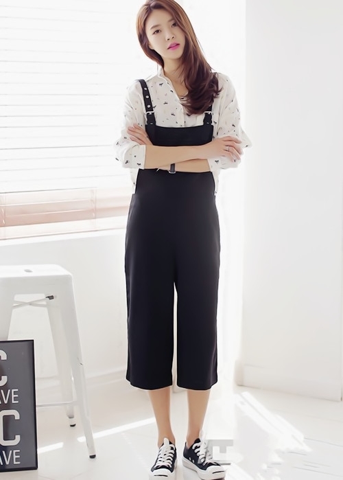 搭配看点:黑色七分阔腿背带裤十分的显瘦和舒适,非常适合腿粗的菇凉选择哦,轻松把双腿藏在大裤腿里。上衣选择一件淡雅的印花衬衫,十分气质和清新,职场lady也可以作为通勤装搭配哦,将鞋子换成黑色尖头高跟鞋或鱼嘴鞋都很赞呢。