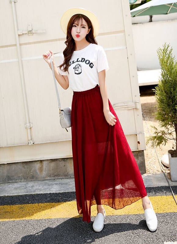 搭配看点:白色T恤+酒红色雪纺长裙+白色平底鞋+米色大沿帽。飘逸的雪纺长裙是校园青春女神必入的单品之一,酒红色为长裙又带来了几分气质之感,搭配一件简单的白T与白色休闲鞋,将你的锋芒光彩发散得刚刚好。