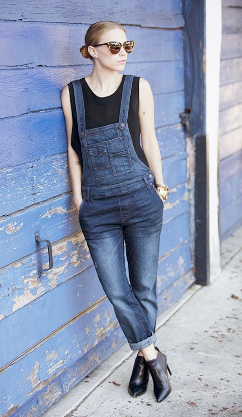 LOOK 4:牛仔背带裤+黑色无袖上衣