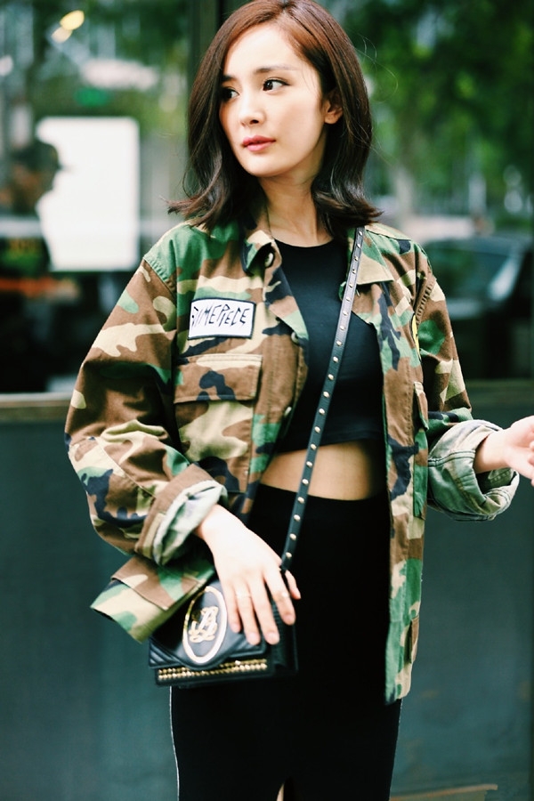 杨幂这组夏季街拍图片十分的率性不羁,黑色短top露出幂幂性感的腰部,下搭前开衩高腰半身裙,凸显杨幂完美的身线。脚踩简约舒适的懒人鞋,十分贴近生活的日常搭配却给人轻熟优雅的气质。再外搭一件帅气的军旅风迷彩外套,精致假小子形象立现,非常适合杨幂新剪的短发哦。