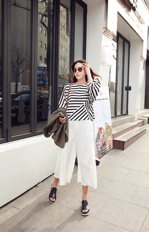 搭配看点:白色阔腿裤搭配短款oversize条纹T,很有都市休闲气息,都是宽松的款式,穿起来毫无负担,鞋子也选择舒适的鱼嘴鞋,时髦又上衣色彩呼应,十分清爽的夏日出街look,菇凉们赶紧尝试吧。