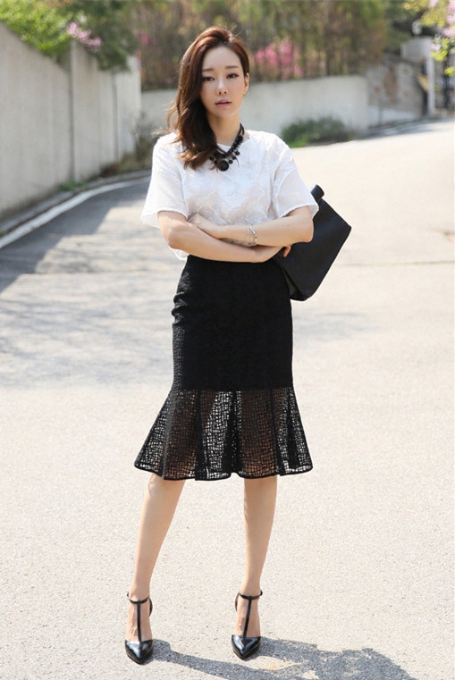 搭配看点:白色蕾丝上衣搭配高腰鱼尾裙很有知性风范,非常适合职场lady尝试,轻松穿出丽人气质。而经典的黑白配色也显得十分大方和精致,配饰上选择个性的手拿包和尖头高跟鞋,更添时髦气场,脖间的配饰让造型更加有范哦。