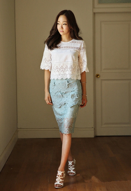白色蕾丝上衣+淡蓝色包臀裙+高跟鞋