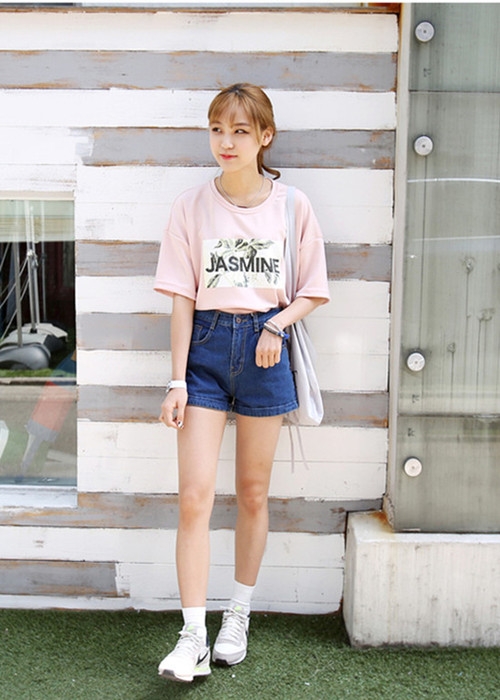 搭配看点:粉色与蓝色搭配总能给人不一样的时尚韵味,清凉夏日,粉色T恤搭配高腰牛仔短裤十分简约清爽,或者选择绯色T恤配破洞牛仔裤也能带来另类的时尚气息。