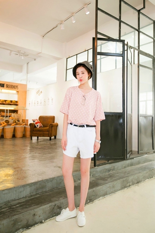 搭配看点:粉色T恤搭配时下正热的白色短裤也十分自然随性,戴上chic的棒球帽、宽檐帽或渔夫帽,轻松提升时尚指数。