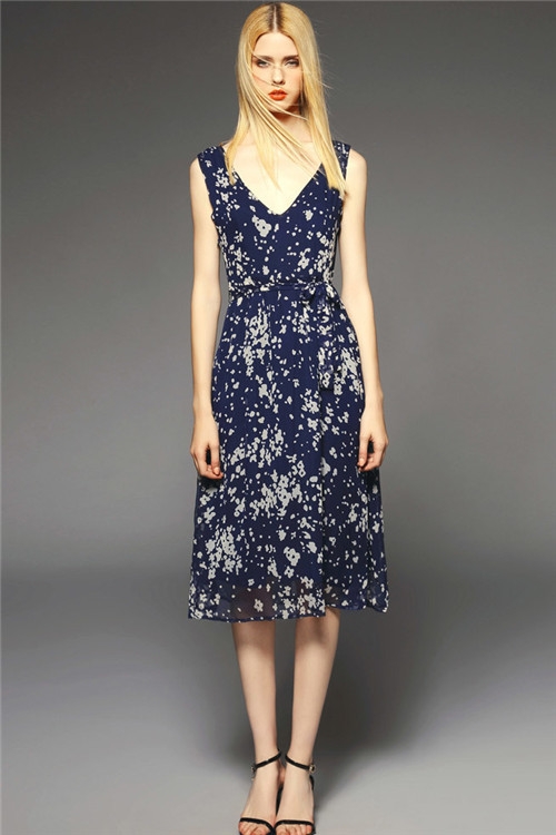 单品推荐:无袖V领收腰露背真丝连衣裙