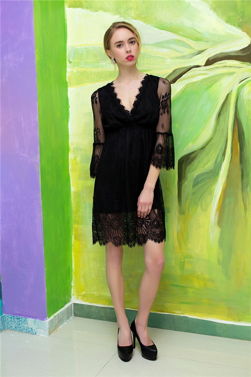 这款的特点是大深V,非常非常的性感,蕾丝柔软,里面有内衬,非常亲肤。除了外穿,这款在家当睡衣也是完全OK的。蕾丝袖的设计还增添了整件衣服若隐若现的诱惑感。