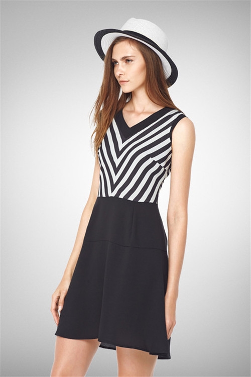 黑白条纹的交错视觉带来更多的趣味,修身版型完美显示窈窕身材,下身拼接腰围处小、下摆较大的A字裙,穿上显得人很眼光。