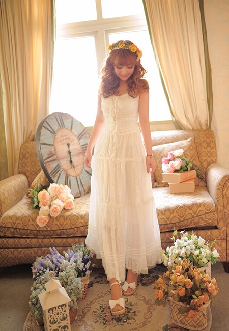 纯色蕾丝吊带长裙+花环+白色高跟凉鞋